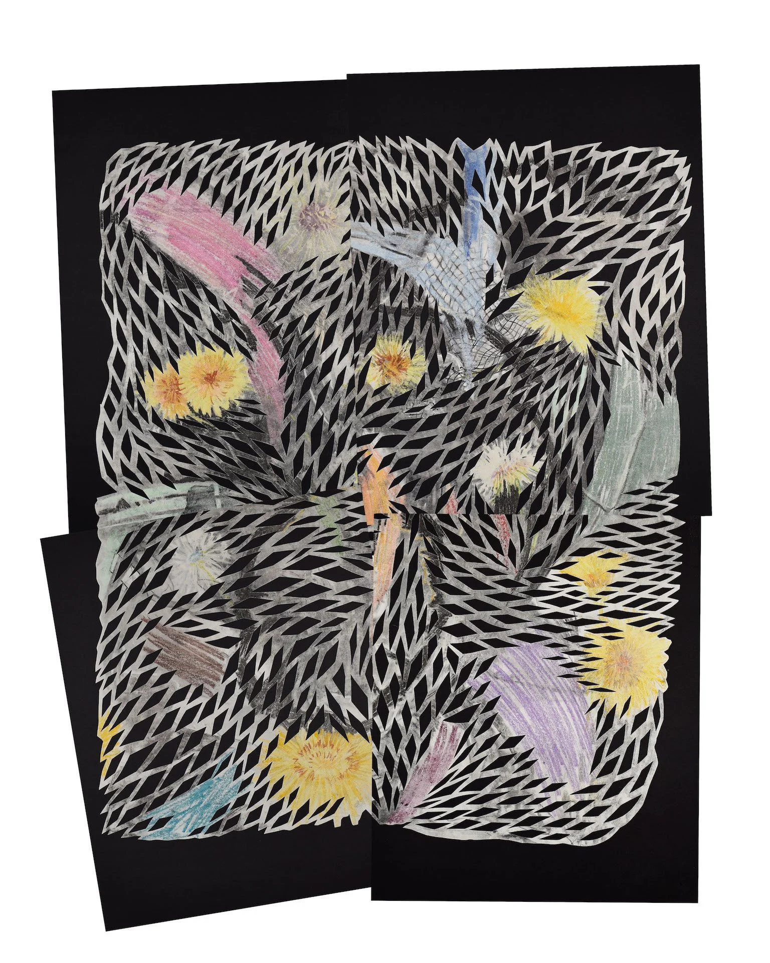 Reoccurrence, / 2024 / Charcoal and pastel monoprint on Stonehenge, relief ink, ~60”X80”, composed of 4 panels each of varied dimensions